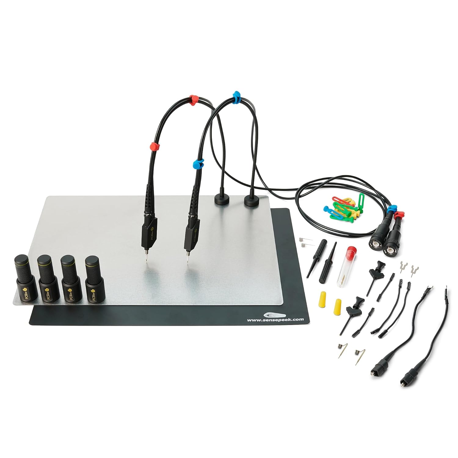The new SQ series of handsfree probes from Sensepeek have a lower point of gravity making them even more stable compared with the original SP series of handsfree probes.All probes in the SQ series are also insulated and can be used handheld as any traditional probe but their full potential is used when measuring handsfree.The SQ series of oscilloscope probes also includes more ground options, have probe tip protection, longer cable and support for oscilloscopes with automatic scaling (10:1)All the loved features of handsfree measurement, exchangeable fine pitch spring tipped test needle, color-coded cable holders and the minimalistic design is maintained to make traditional sized and handheld probes obsolete.Both length and weight of the SQ probes are perfectly balanced to be used with the included PCB holders and base plate which is a must for handsfree function.The probe holder comes with a powerful magnet in the base, as for all PCBite probes and holders which makes the probe easy to place and reposition.One side of the included baseplate is matte and the other is mirror polished. The mirror-polished surface makes it easy to see components on the circuit board underside. For added protection during measurement the included insulation cover can be mounted on one of the surfaces. See user guides and included articles.Includes:4× PCBite PCB holders1x Set of yellow insulation washers for the PCB holders1x Large Base plate (A4)1x Insulation cover for the base plate (A4)1x Microfiber cloth2x SQ200 - 200 Mhz handsfree oscilloscope probes