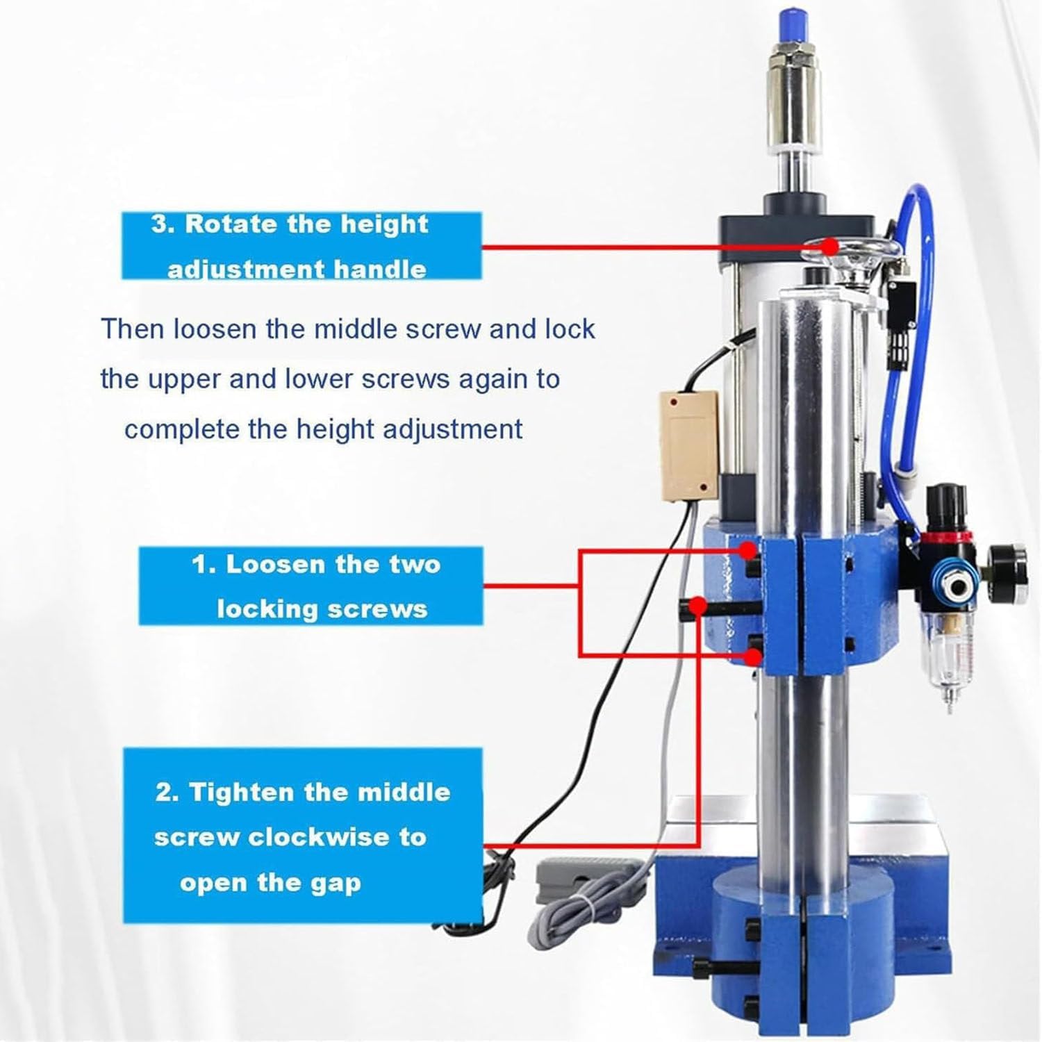 The pneumatic press stands out for its hygiene and cleanliness, utilizing advanced photoelectric protection technology to significantly enhance safety. It features computer counting and programming capabilities, enabling unattended operation and greatly improving work efficiency. This machine is versatile, suitable for industries such as electronics, instruments, cameras, jewelry, hardware, clothing, shoes, and hats. It performs various processes including thin, strip, and coil shear, punching, blanking, forming, bending, and riveting, and is ideal for processing non-ferrous metals and plastic parts. Customization of punching speed, stroke, pressure, and time is straightforward, catering to different product requirements and models, with working pressure adjustable between 0.4 and 0.7 MPa for specific needs. Parameters include: Name: Pneumatic Punch Press Machine; Voltage: 110V/220V; Power Type: pneumatic; Pressure: 200 kg / 300kg; Die hole diameter: 12 mm / 16 mm; Working Countertops Size: 150x130 mm / 150x150 mm; Tracheal diameter: 63x75 mm / 80x100 mm; Adjustable cylinder size: 63x75-50 mm / 80x100-50 mm; Working Height: 200 mm / 250 mm; Operations pressure: 0.4-0.7 Mpa; Layout form: vertical; Usage Scope: in common use; For industry: in common use. Package includes: 1 x Pneumatic Punch Machine.